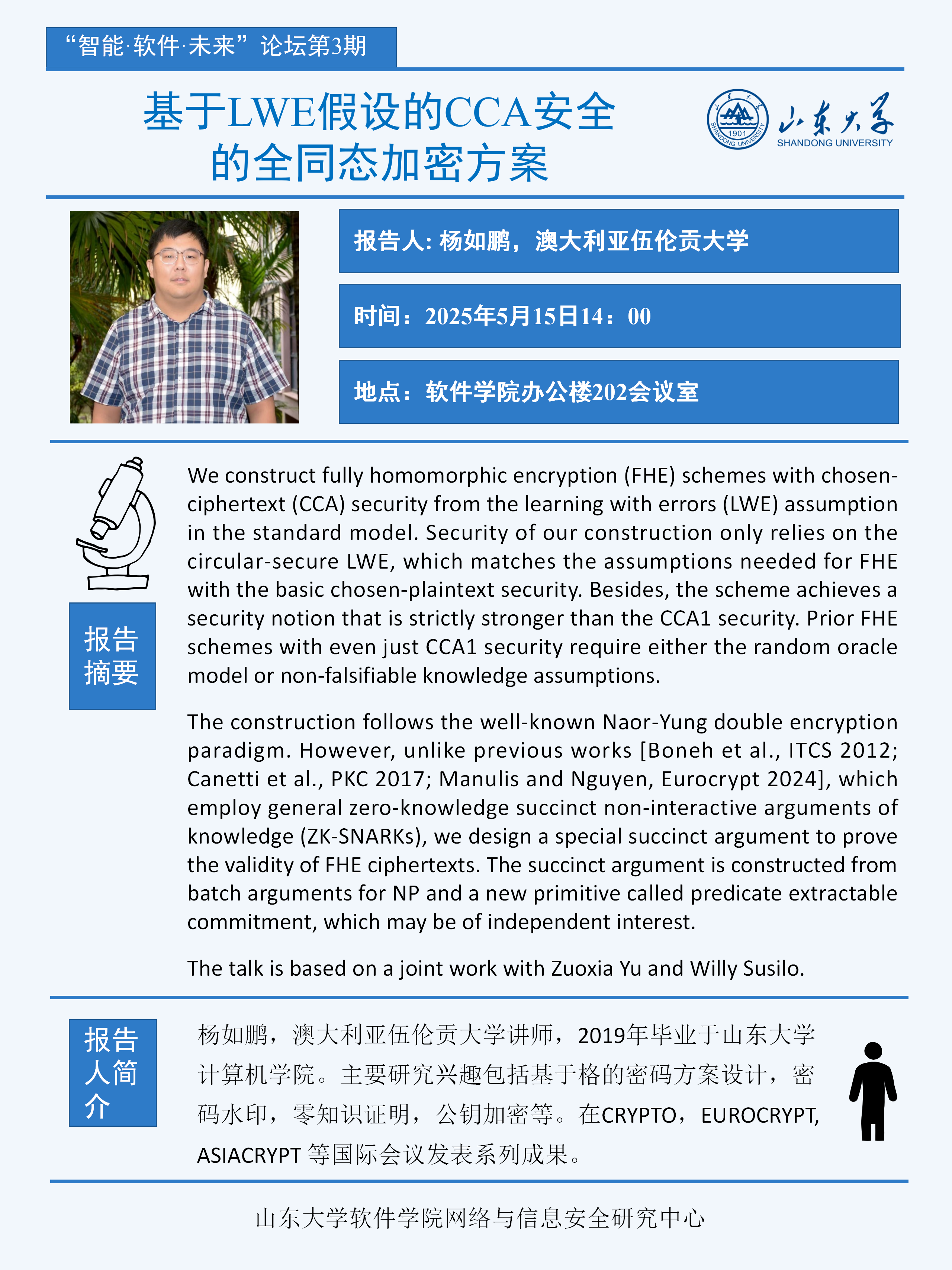 【学术预告】软件学院“智能·软件·未来”论坛第3期:基于LWE假设的CCA安全的全同态加密方案