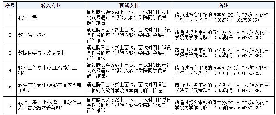 4、面试内容:包括学生的基本情况、对转入专业的理解、逻辑分析能力、学习能力等方面的综合素质;