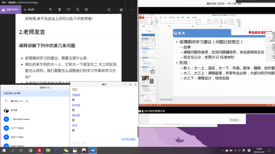 互动过程中,张鹏老师鼓励同学们战疫期间充分利用好居家时间,做好个人的全方位提升规划,要调动自己的主动性,提升学习动力、提高身体素质,建立健康的作息和饮食习惯,做到学习身体两不误,良好习惯逐步在家养成。戴鸿君老师强调了实践在软件工程专业的重要性,他认为,软件工程专业是一门注重实践的学科,同学们要将居家的这段时间有效利用起来,在家多进行实践,提高实践能力和动手能力,在实践中学习,实践中进步。徐延宁老师则就动漫、游戏方向的选择提出建议,他建议同学们权衡动漫领域和游戏领域的“需求-供给”和“风险-收益”,并根据自己的兴趣来选择;要对选择的方向有充分的了解,认真对比各方向所需的专业技能,考虑适合自己的方向。徐老师还向同学们分享了一些动画方面的课外教程,鼓励大家在学有余力的情况下保持对知识的渴望。