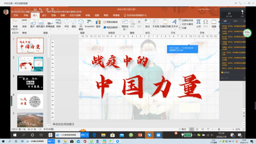 7月8日下午,软件学院学生党员先锋促进会通过微党课的形式,举行“战疫下的中国力量“本科生党支部主题党日活动。本次主题党日活动由软件学院党委副书记吴天柱主持,17级和18级全体党员、预备党员、发展对象及入党积极分子参与。