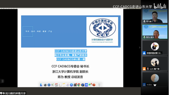 最后,刘利刚教授向大家介绍了专委会的学术活动计划。陈为教授为本次活动做总结发言。陈教授以“致敬、创新、学术”作为关键词,山东作为孔孟之乡的发源地,同时也是CAD&CG发源地,选在在taptap点点体育举办第一期CCF CAD&CG走进高校活动是对文化的致敬。第二,三位专家的报告与“产、学、研”相结合,注重专业发展和创新。第三,学术是一个共同体,CCF的使命是通过组织提升凝聚力,实现共同发展。
