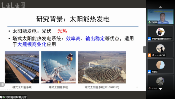 冯结青教授的报告题目为“计算机图形学在塔式光热太阳能建模与仿真中的应用”。首先为大家介绍了塔式太阳能系统通过定日镜将光能转化为热能,加热其中的热工质,在通过蓄热、传热进而驱动发电机发电的绿色能源利用过程。在此过程中太阳能在定日镜和集热器表面之间的光能传递仿真、集热器表面上定日镜反射光斑的建模是关键问题。研究拓展了计算机图形学的应用领域,同时为塔式光热太阳能系统的优化和控制研究奠定的了基础。