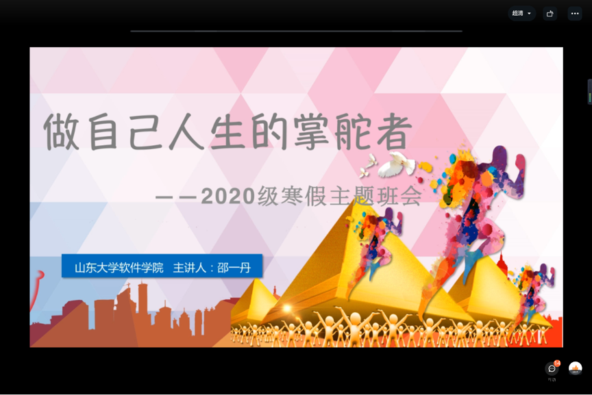 为更好地服务大学生成长成才,帮助学生树立理想信念,引领青年学子与时代同行,规划成长路径,助力他们点亮理想之灯,照亮前行之路。2月8日软件学院2020级本科生召开了以“做自己人生的掌舵者”为主题的寒假主题班会,2020级本科辅导员邵一丹担任主讲人,全体学生悉数到会。