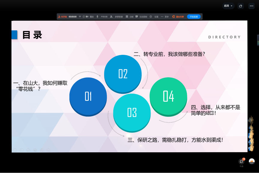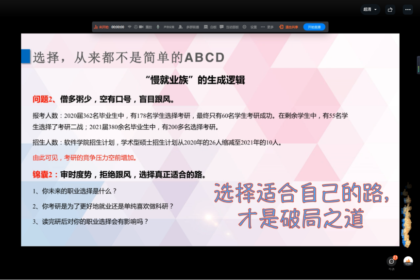 当代青年应勤奋好学,志存高远, 2020级学生虽然刚刚开始大学生涯,但也需要用长远的眼光去规划自己的未来发展。邵一丹通过现身说法在保研和就业两条方向选择上给同学们带来了鞭策和鼓舞。首先,邵一丹就推免条件、推免类别等进行了详细的介绍,结合事例与数据为同学们指明了努力的方向。邵一丹强调,保研之路并非一蹴而就,而是需要在每个环节稳扎稳打,大家在汲取养分中积累沉淀,脚踏实地,方能水到渠成。随后,邵一丹通过分享往届毕业生就业情况向学生们展示了“慢就业族”的现象,并从三个方面提出了合理的解决方法:一、对于“专业知识学习不到位,存在就业恐慌”的困难,应夯实基础,寻求资源,把握机会,主动出击;二、对于“僧多粥少,空有口号,盲目跟风”的问题,应审时度势,拒绝跟风,选择真正适合的路;三、对于“享受安逸,逃避就业”的现状,应走出舒适圈,把握保鲜期,拒做啃老族。三条锦囊既给我们敲响了警钟,也给我们提供了指南。