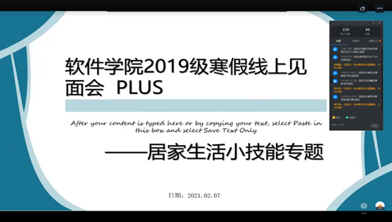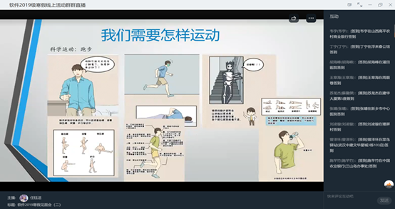 2021年2月8日晚,软件学院2019级召开第二次寒假线上见面会暨“假期生活汇”专题活动,本次活动由软件工程专业学生任钰洁主持,2019级全体学生及辅导员刘学帅参加见面会。