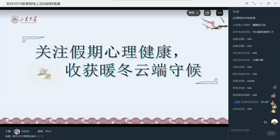 活动首先进行了疫情动态播报,帮助同学们了解国内外疫情的最新进展,随后2019级辅导员刘学帅与同学们进行连麦互动,倡导广大同学遵守疫情防控的各项规定,做好个人防护,尤其是在即将来临的春节期间要少串门、不聚集,过一个欢乐祥和、健康平安的新春佳节;同时建议同学们在春节到来之际,将自己过去的一年进行梳理总结,并为自己未来的一年做好规划,争取新的学期有一个良好的开局。