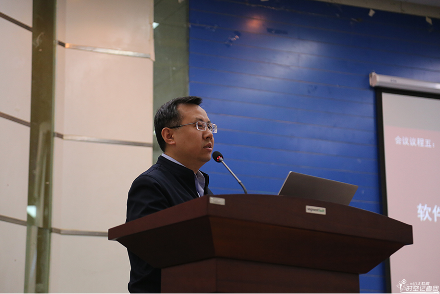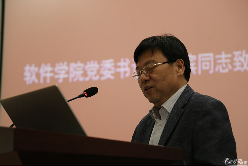 接下来,软件学院青年联合会第一届主席团主席周元峰进行大会发言。周元峰肯定了青年教师的创新能力和青春状态,指出青年联合会应有的历史责任与使命担当。他提到,许多德才兼备的老教师,以他们的诲人不倦与桃李芬芳,引领青年教师担起教书育人、科研创新、兴学强院的责任。周元峰还代表青年联合会主席团承诺,他们将为各位老师提供良好服务,把青年联合会应有的作用发挥出来,在双庆的历史时刻,承担历史责任,将“兴学强院”作为己任。