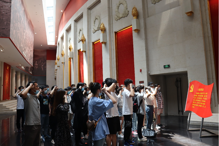 十点十五分,全体党员同志进入莱芜战役纪念馆“鲁中抗日战争展览馆”参观。“鲁中抗日战争展览馆”共有序厅和四个展厅。序厅主要内容是全民抗战的主题雕塑和播放抗战原始史料片的大型LED电子屏;第一展厅主要向参观者揭露日军暴行;第二展厅重点展示抗日根据地的发展历程;第三展厅重点展示著名战役战斗;第四展厅重点展示英模人物事迹。参观过程中同志们紧跟讲解员步伐,认真观察展厅图片,仔细阅读其中文字,深刻感受鲁中抗战的不易,领悟学习英模人物精神。参观完“鲁中抗日战争展览馆”,同志们在序厅外纪念碑前集合,在邵一丹带领下重温入党誓词。同志们掷地有声的宣誓让周围群众也被感染,纷纷掏出手机记录下这满怀青春力量的一刻,眼神中流露着对青年党员同志的赞赏与鼓励。
