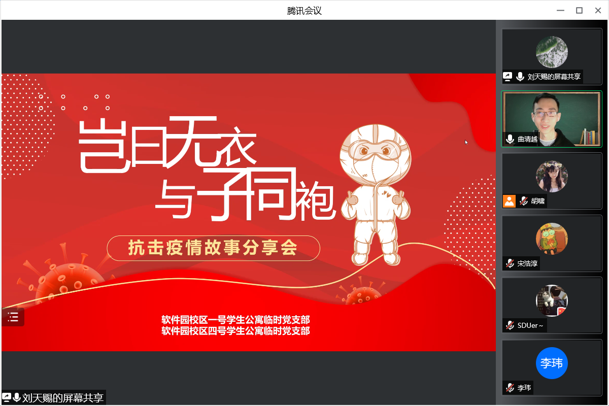 4月17日晚,软件学院疫情防控学生临时党支部通过腾讯会议线上平台联合举行“岂曰无衣 与子同袍”抗击疫情故事分享会,本次会议由软件学院学生党员先锋促进会宣传部刘天赐主持,旨在挖掘身边的抗疫故事,分享战疫力量,树立抗疫工作先进典型,弘扬奉献、友爱、互助、进步的志愿者精神。支部全体成员参与了此次会议。
