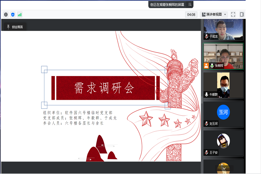 4月19日晚八点,软件学院六号学生公寓临时党支部通过腾讯会议平台线上召开师生需求调研会,本次会议由张桐珲主持,旨在切实保障封校期间同学们生活学习需要,充分了解当前形势下师生最迫切的需求。软件学院六号学生公寓临时党支部全体成员和六号楼各层长与舍长参加会议。
