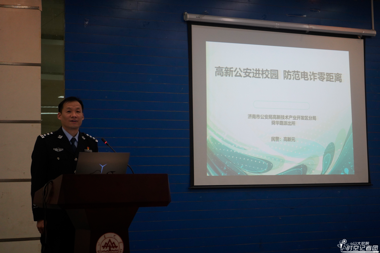 在主题讲座中,高新元警官就电信诈骗这一问题进行了相关分享。他从学生身边开始举例,通过列举近年来在软件园校区中发生的诈骗事件,让同学们认识到诈骗就在自己的日常生活中,以此提高同学们对电信诈骗的警惕性。随后,他通过列举具体事例、分析典型事件等方式向学生们介绍了电信诈骗的定义、常见种类及特点,生动形象、风趣幽默、深入浅出,让学生们能够更深刻地认识电信诈骗。为帮助学生更好地在实际中保护个人安全,他为同学们讲解了一些反诈方法,帮助同学们增强反诈意识,提高反诈能力。