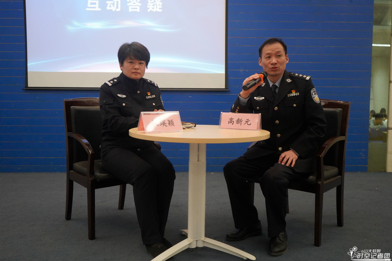 为进一步解决学生的问题和疑惑,本次讲座设置了答疑环节。同学们热情高涨,踊跃提问,涉及问题包括电信诈骗、网络安全等多个方面,两位警官对同学们提出的问题做出了专业而详细的解答。