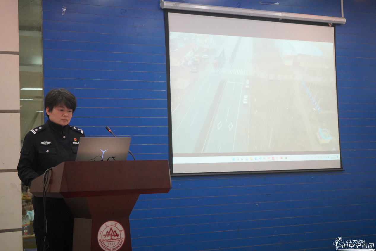 杜瑛颖警官重点介绍了交通安全方面的知识。她以短片为引入,展示了多起交通事故的发生过程,以视觉冲击帮助学生牢固树立交通安全意识。短片播放过程中,杜瑛颖穿插进行讲解,提醒同学们一定要重视交通安全。短片结束后,她结合短片内容,根据校园交通安全特点,强调了在校园中安全交通的注意事项。杜瑛颖指出,安全无小事,同学们必须提高主动防范意识。最后,她为同学们普及了网络安全的相关知识,提醒同学们注意个人隐私,保护个人信息。