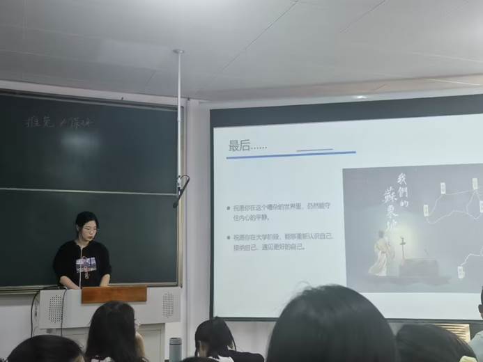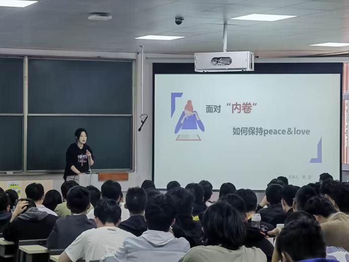 为帮助新生明确自我定位、端正学习态度,理性看待学习成绩,缓解学业压力和焦虑,5月8日,软件学院举办“走进心灵——面对内卷,如何保持peace&love”主题讲座,2022级辅导员姚蕊主讲,部分学生参加讲座。