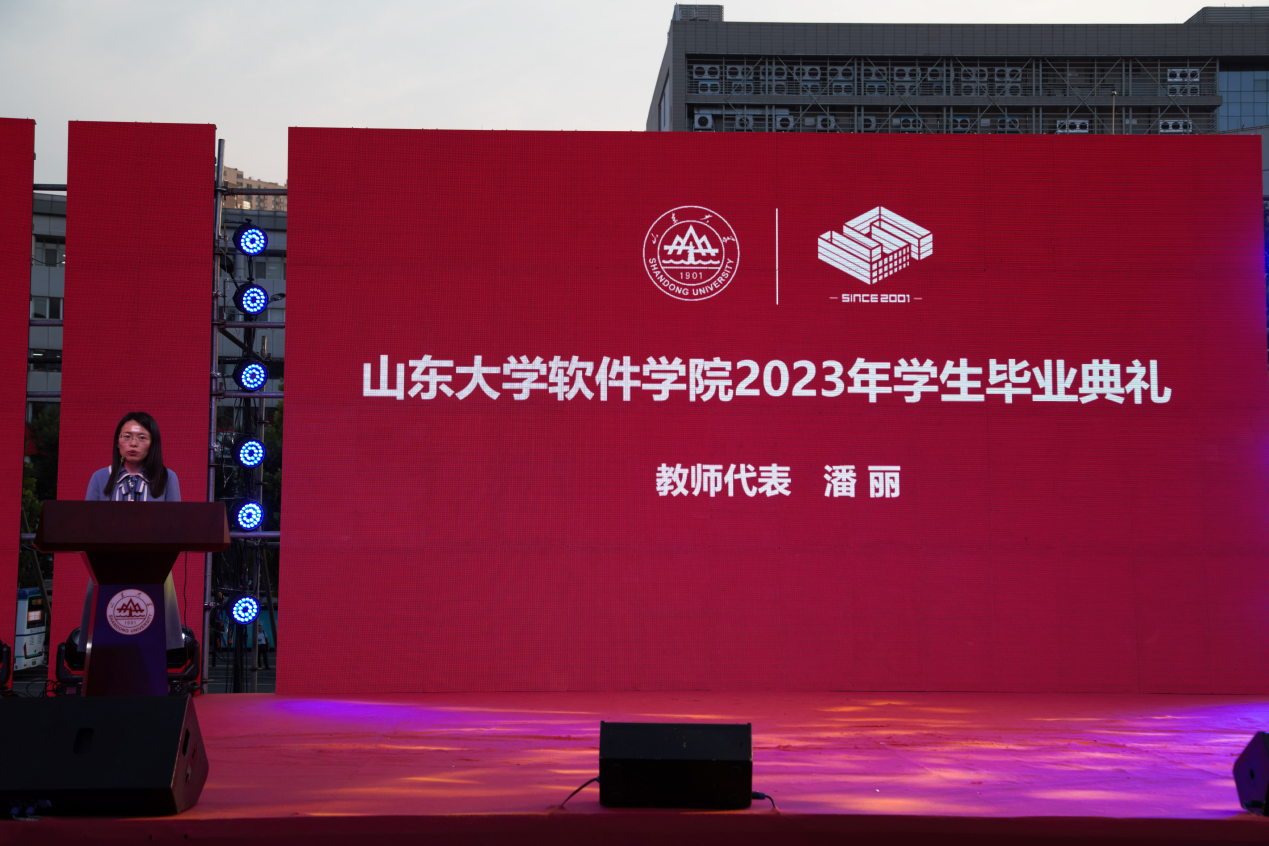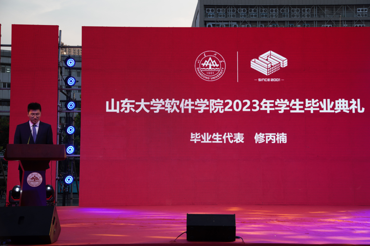 教师代表潘丽与学生代表修丙楠相继发言。潘丽表示,毕业生要保持创新思维的开拓之心、终身学习的进取之心和社会责任的奉献之心,在未来的职业道路上追求卓越。她希望毕业生践行“学无止境,气有浩然”的校训精神,牢记使命,把自己的成长与国家发展紧密相连,把中国软件推向世界,贡献祖国的辉煌未来。毕业生代表修丙楠回忆了三年来学习生活的点滴与成长的苦乐。他表示,在软件学院学习成长是幸运的,自己和同学们一定会带着软件学子的使命和担当,勇敢追梦,创造精彩人生。最后,他代表全体毕业生向师长与父母表达感谢、献上祝福。