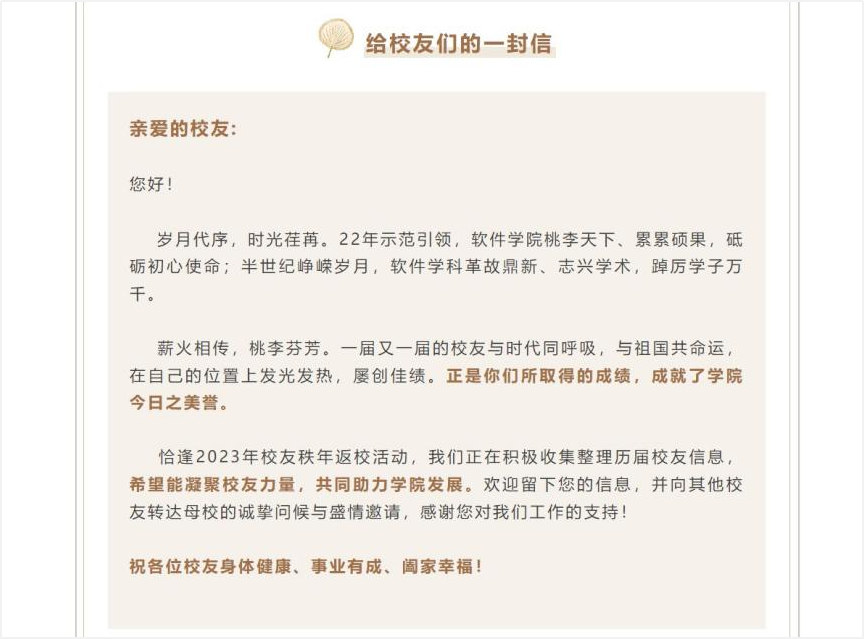 密切校友联系,健全信息建设。2023年暑期,学院发布“给校友们的一封信”,借助公众号、校友群等途径点对面收集整理了历届校友信息,并将毕业校友信息导入校友信息库,实现校友信息规范化,助力实现“人人有回应、班班有联系、级级有代表”的网格化联络体系。