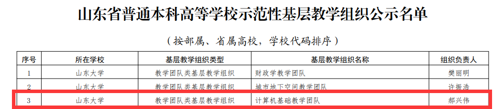 近日,山东省教育厅公布《山东省普通本科高等学校示范性基层教学组织名单》,学院郝兴伟教授带领的计算机基础教学团队荣获示范性教学团队类基层教学组织。