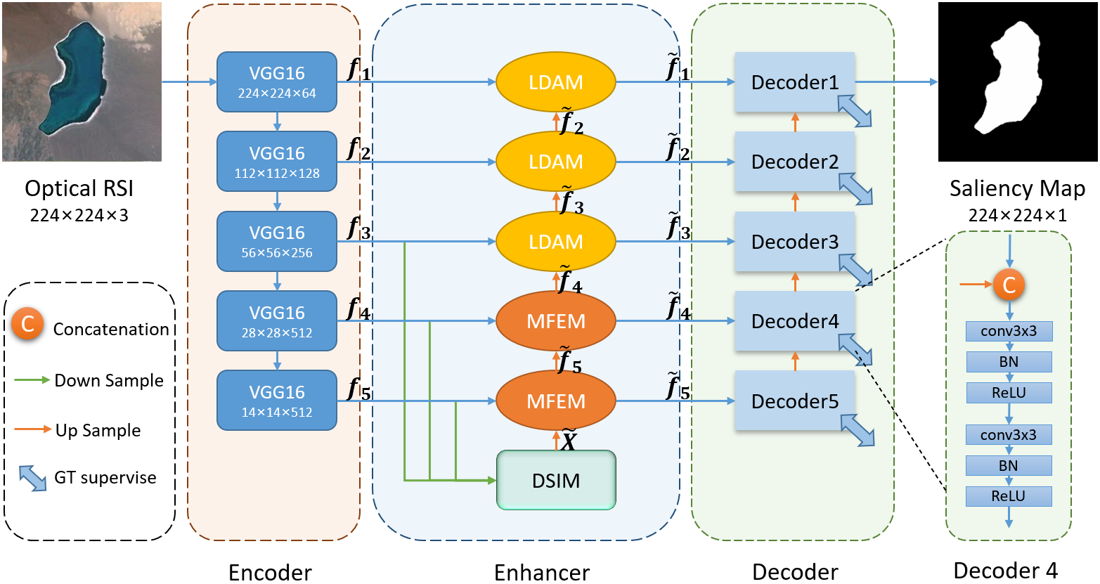 近年来,得益于深度学习的发展,光学遥感图像显著目标检测(RSI-SOD)任务受到了广泛的关注。然而,现有的方法在解决光学遥感图像中存在的各种问题方面仍然面临挑战,包括显著性目标物体数量的不确定、杂乱的背景和阴影的干扰等。为了应对这些挑战,我们提出了一种新颖的自适应边缘感知语义交互网络(AESINet),用于有效的光学遥感图像显著对象检测(SOD)。具体来说,为了改善复杂边缘信息的提取,我们设计了一个局部细节聚合模块(LDAM),该模块可以利用我们提出的差异感知机制,自适应地增强显著性目标的边缘信息。值得注意的是,我们的差异感知机制是一种新的边缘增强方法,其学习过程不需要边缘真值信息的监督。此外,为了准确定位不同数量和尺寸的显著性目标,我们设计了多尺度特征提取模块(MFEM)和深度语义交互模块(DSIM),用于捕获和利用多尺度信息,识别杂乱背景中的显著性目标,并有效地减轻阴影的干扰。我们在三个常用的光学遥感图像数据集上进行了广泛的实验,结果表明我们提出的模型优于目前14种最先进的方法。遥感图像显著性目标检测作为一种视觉基础任务,可以为多种下游高层级遥感图像智能解析任务(如特定舰船飞机等目标检测、图像超分辨、遥感图像场景分类等)提供重要目标信息,提升各种遥感图像智能解析任务性能,并广泛应用于军事侦察、国土资源监测等国计民生领域,服务科技强国发展之路。