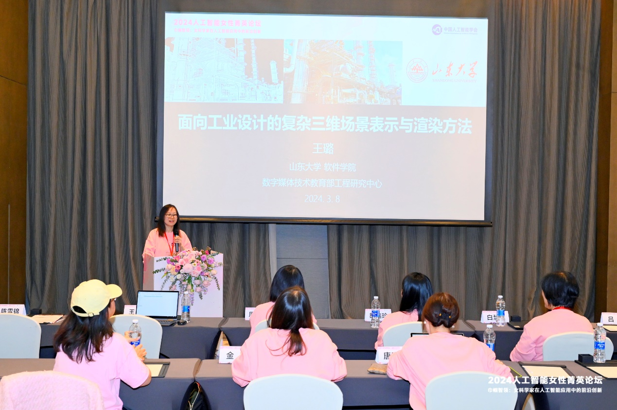 论坛以“巾帼智领:女科学家在人工智能应用中的前沿创新”为主题,设有5个主题报告和2场专题论坛,20多位女专家学者汇聚一堂,分享探讨人工智能的理论、算法、应用等前沿课题。软件学院王璐教授在《智能理论与算法专题论坛》上做《面向工业设计的复杂三维场景表示与渲染方法》专题报告,探索采用AI技术进行复杂几何、材质、光源表示及物理渲染的方法,进一步介绍在CAD、虚拟仿真、产品展示等工业设计领域的应用之方。