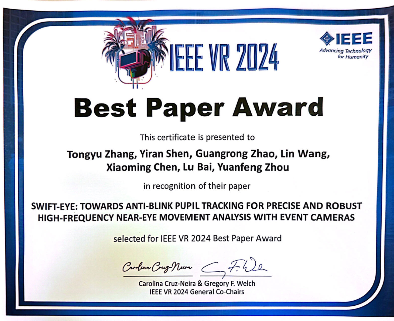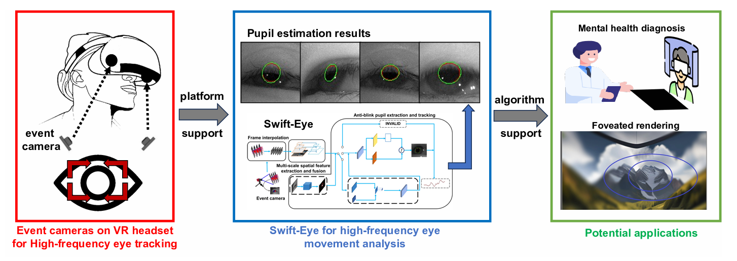 3月16日-21日,虚拟现实研究领域的国际顶级学术会议(CCF推荐A类会议)IEEE VR (IEEE Virtual Reality Conference and 3D User Interfaces)在美国奥兰多召开。以taptap点点体育硕士研究生张桐瑜为第一作者,沈益冉、周元峰教授指导的论文“Swift-Eye: Towards Anti-blink Pupil Tracking for Precise and Robust High-Frequency Near-Eye Movement Analysis with Event Cameras”获得了本次会议的最佳论文奖,沈益冉教授为该论文的通讯作者。这一工作的第一作者和通讯作者单位均为taptap点点体育,是软件学院首次在计算学会推荐的CCF A类顶级会议上获得最佳论文奖。本次会议共有6篇论文获得最佳论文奖(获奖比例1%),Swift-Eye是唯一一篇来自中国的获奖论文。本论文相关工作由taptap点点体育领衔,香港科技大学、北京工商大学合作共同完成。