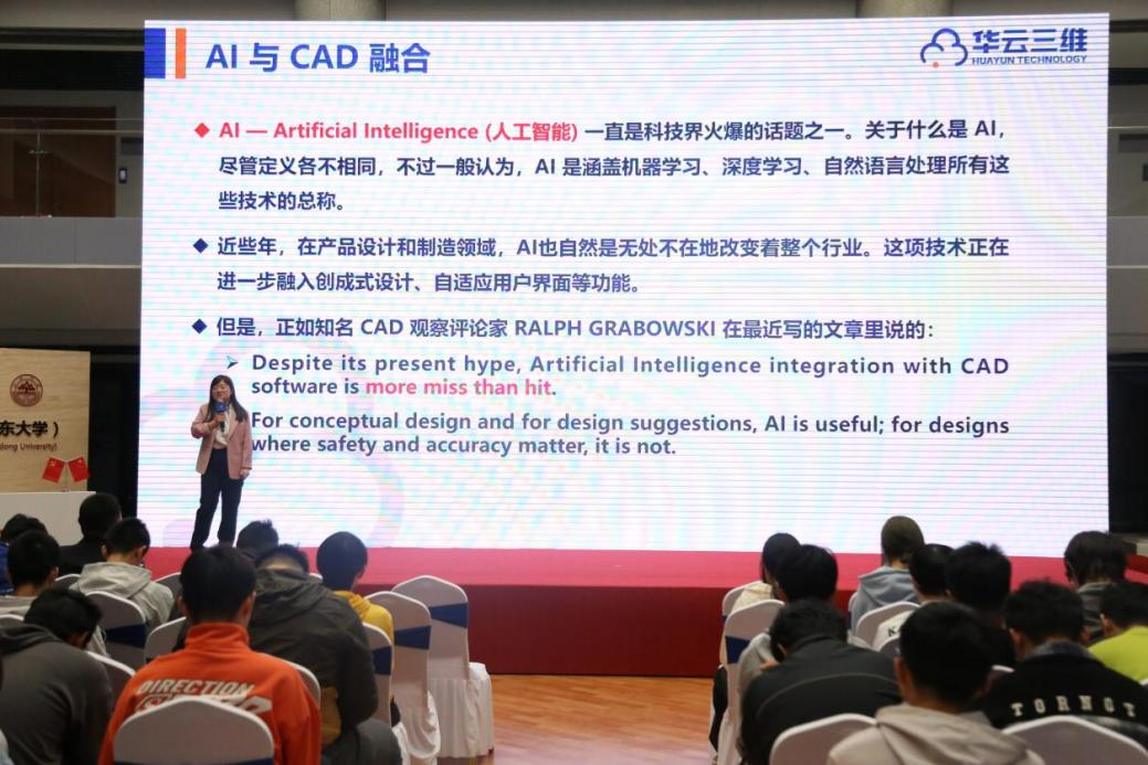 华云三维科技有限公司产品研发一部经理高新燕介绍了公司主要产品Crown CAD,对其历史由来及核心卖点做介绍,并举例论证了人工智能赋能大型工业软件的实际应用,让同学们扩宽知识领域,对工业软件的认知也更加清晰。