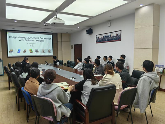 近日, 软件学院人机交互与虚拟现实研究中心在数媒楼107会议室成功举办了一场学术会议,会议邀请了米哈游逆熵研究院的林铖研究员作以”基于扩散模型的3D内容生成“为主题的报告,吸引了学院相关方向的研究生和本科生参加,会议由软件学院杨承磊教授主持。