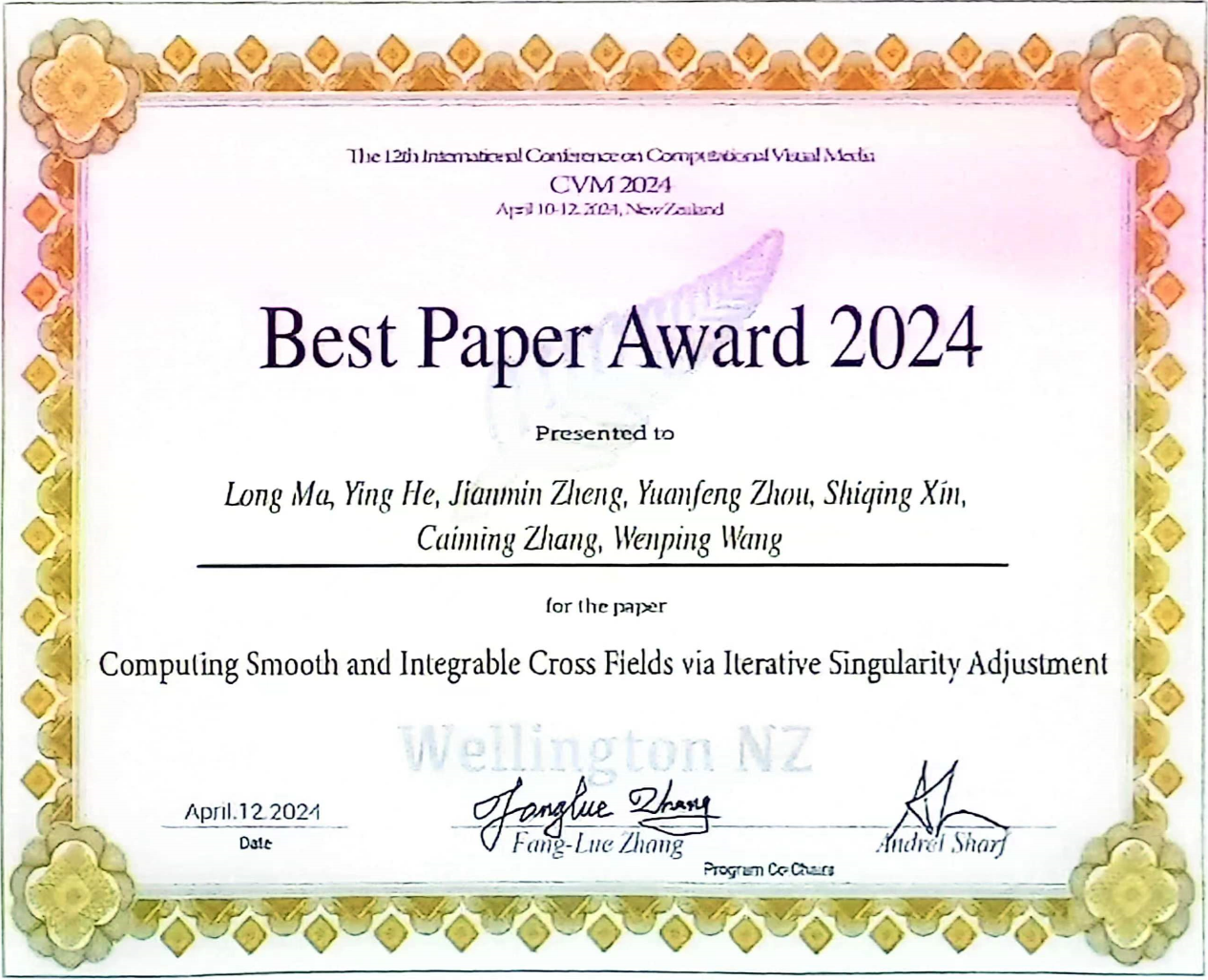 4月10日-12日,第十二届Computational Visual Media(CVM2024)会议在新西兰首都惠灵顿举行。taptap点点体育马龙副研究员为第一作者完成的论文“Computing Smooth and Integrable Cross Fields via Interative Singularity Adjustment”获得了本次会议的最佳论文奖,其他合作者包括新加坡南洋理工大学贺英副教授、郑建民教授,taptap点点体育周元峰教授、张彩明教授,计算机学院辛士庆教授,美国德州农工大学王文平教授。
