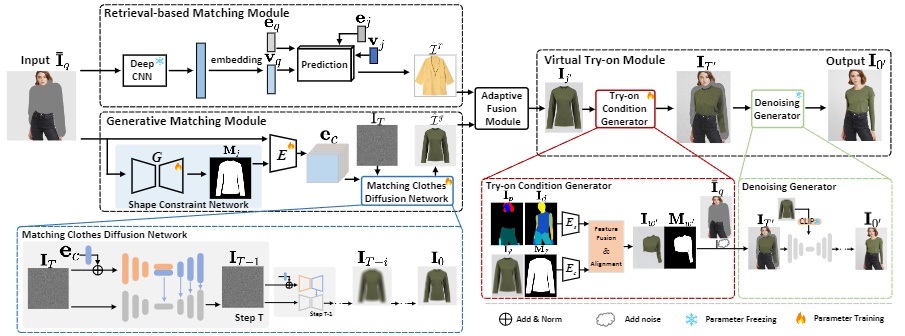论文提出了混合匹配感知虚拟试穿框架(HMaVTON),结合了基于检索和生成的方法,以促进更个性化的虚拟试穿体验。其中混合搭配模块结合检索与生成方法,不仅可以检索平台上已有的时尚单品以促进销售,而且可以生成符合消费者多样化品味的衣服。如下图所示,在基于检索的匹配模块(Retrieval-based Matching Module)中,文中使用结合图像特征和潜在特征的视觉贝叶斯个性化排序进行推荐。在生成匹配模块(Generative Matching Module)中,文中使用掩码和部分遮挡的查询图像作为控制条件来生成匹配的图像。并通过自适应融合模块(Adaptive Fusion Module)决定推荐生成服装或检索服装,使用阈值控制生成物品与检索物品之间的比例。基于推荐得到的服装,虚拟试穿模块(Virtual Try-on Module)可以生成可视化的试穿图像,提供高质量的试穿效果,实现一站式购物服务。