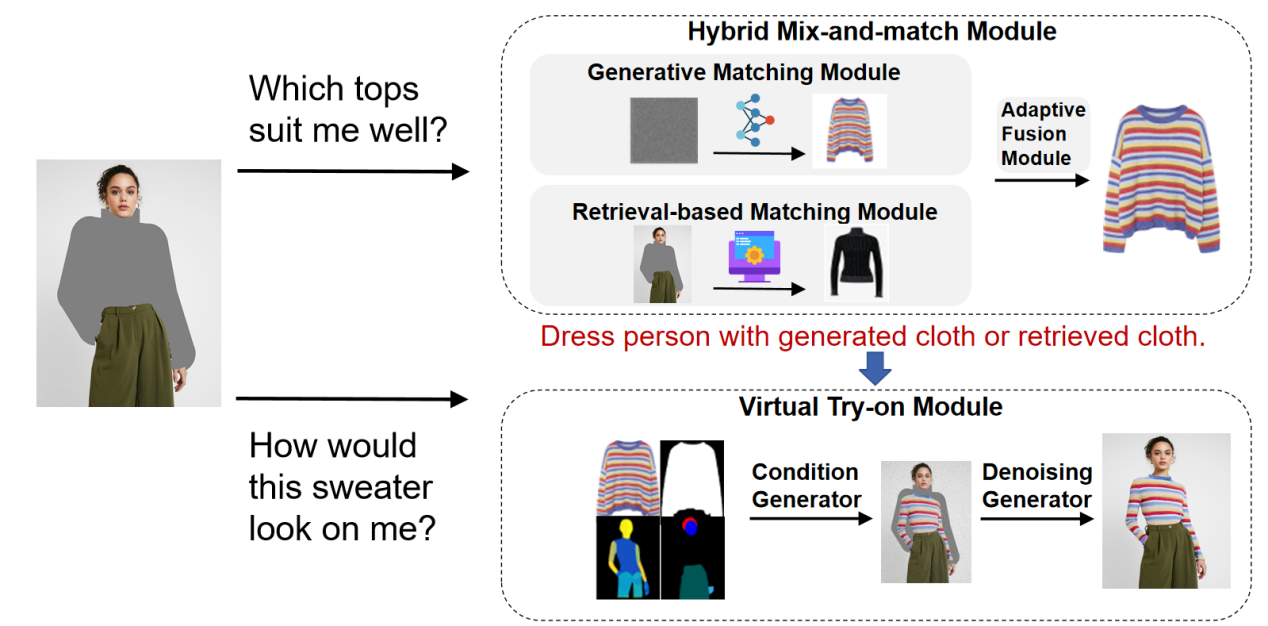 该工作以时尚推荐领域中的服装搭配问题作为切入点,探究了生成式AI 和检索相结合的方法,提出服装搭配与试穿一站式框架。