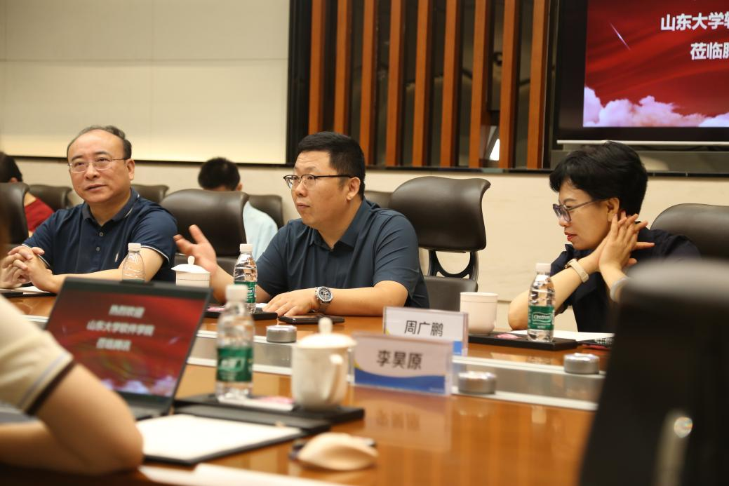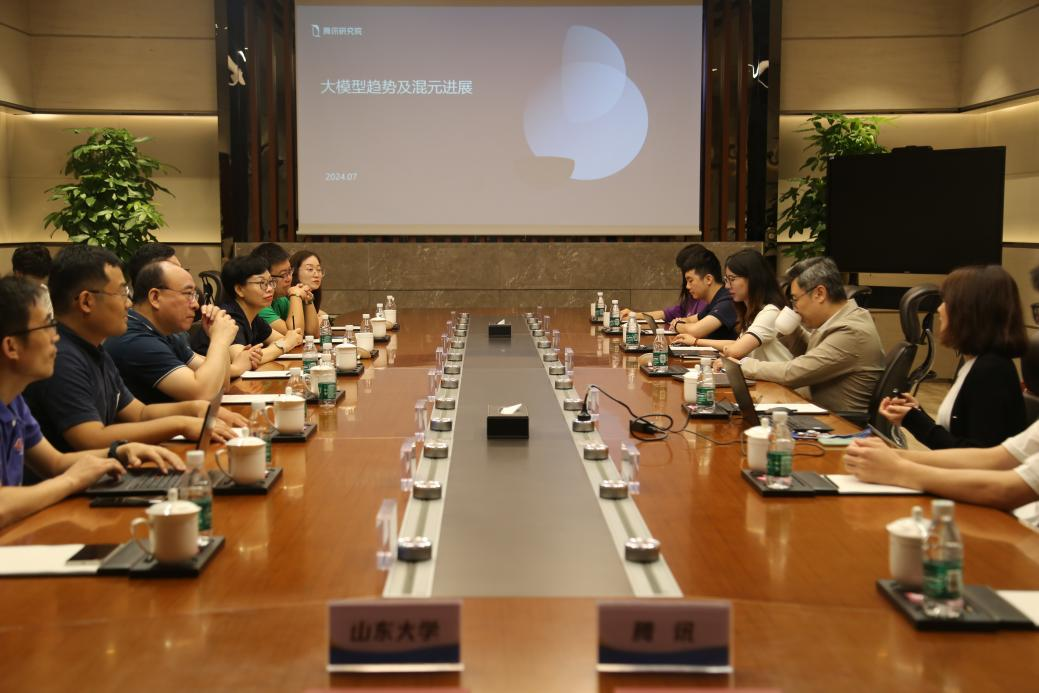 随后双方进行座谈交流,针对产业发展、人才培养、科研创新、校园招聘等“产学研就”全方位合作模式深入交换意见,腾讯研究院公共事务关系总监王洋介绍了腾讯的整体发展情况、前期校企合作案例,期待以此次交流为契机,在产业、人才、科研等领域与山大建立更为紧密的战略合作关系。姜炳刚表示,要在深化教育、科技、人才发展综合改革的时代要求下,在全新的科技革命和产业变革浪潮中,希望进一步凝聚校企双方力量,携手共促产教融合、产研融合发展,实现人才共育,在关键技术领域,定向培养、输送特色化软件人才,共同服务国家战略需求。