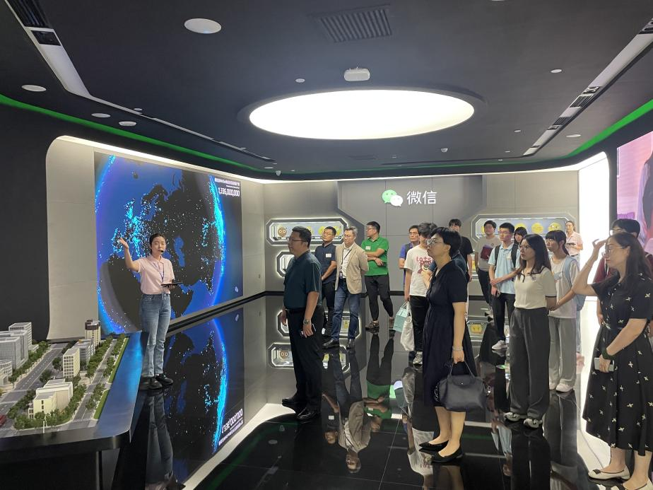 团队首先参观了腾讯总部展厅,腾讯工作人员讲解了二十年来公司的发展历程、企业文化、主要产品等,结合实景技术,现场演示最新的科技在教育、医疗、公益等领域的实际应用,结合七星数据中心沙盘,展示腾讯云技术承担的社会责任与科研任务,团队对腾讯在互联网、数字化、科研领域的发展有了更深入的了解。