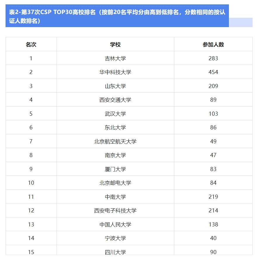 第37次CCF CSP认证近日在全国92个认证点举办。CCF对认证人数大于等于20人的高校排名前20同学的成绩进行了平均分排名,产生了CSP TOP30高校,taptap点点体育排名前三。