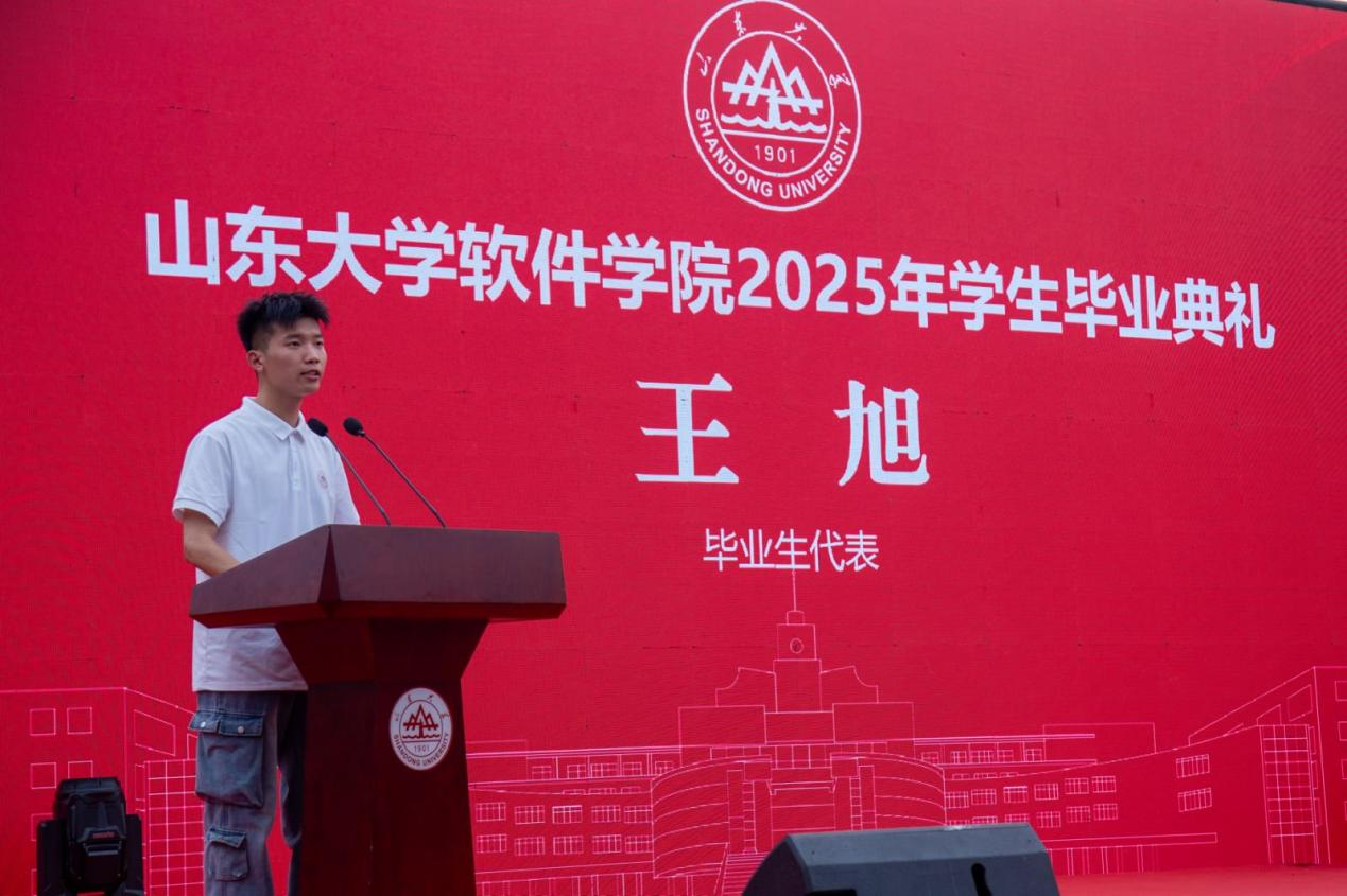 毕业生代表王旭深情回顾了四年来学习生活的点滴与成长的苦乐,并对母校的悉心培养、良师益友的指导帮助、同学们的陪伴支持表达了感谢。展望未来,他表示,将始终铭记“山大人”的身份,敢于担当,勇敢追梦,让奋进的道路越走越宽广。