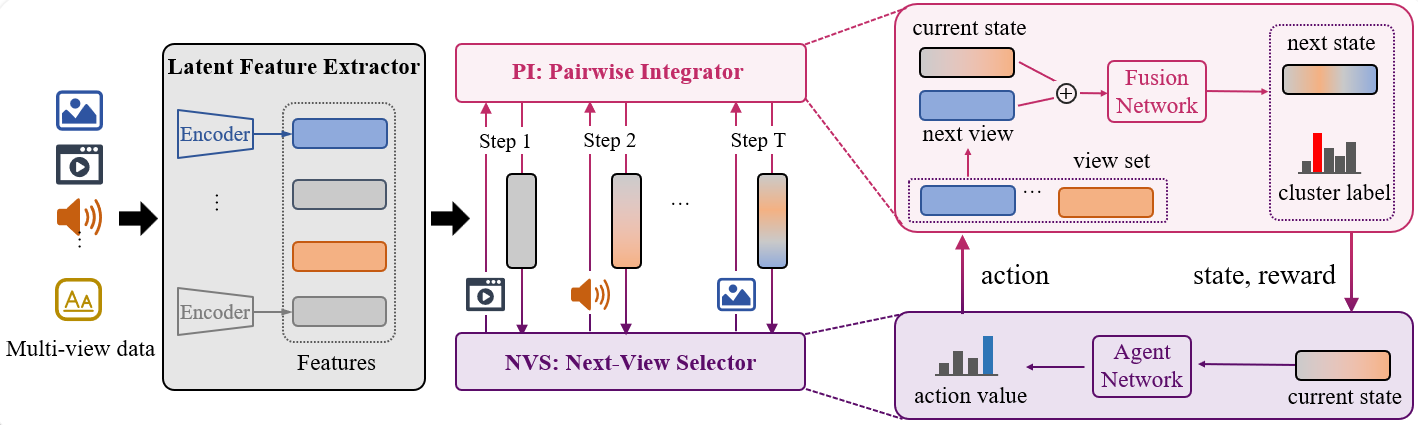论文简介:多视图表示学习旨在通过整合实体的多个可观测视图来构建统一表示,以提升下游任务的性能。现有方法主要侧重于识别视图间的兼容成分,并采用单步并行融合策略进行整合。然而,这种静态的并行融合机制未能充分考虑视图间潜在的冲突关系,从而限制了表示的有效性。针对这一局限性,本文提出了一种基于序列式融合的多视图表示学习框架(SeqMvRL)。该框架将多视图融合过程建模为顺序决策问题,创新性地引入了成对集成器(PI)和下一视图选择器(NVS)两个核心组件,分别对应强化学习中的环境和智能体。其中,PI负责将当前融合特征与选定视图进行动态整合,NVS则通过学习策略自适应地选择最优的下一融合视图。这种序列式融合机制能够根据当前融合状态动态调整视图融合顺序,有效缓解视图间的冲突问题,从而提升统一表示的质量。此外,本文设计了一种新颖的奖励函数,通过强化特征可辨别性来指导视图选择过程。在分类和聚类任务上的实验结果表明,SeqMvRL框架显著优于传统的并行融合方法。