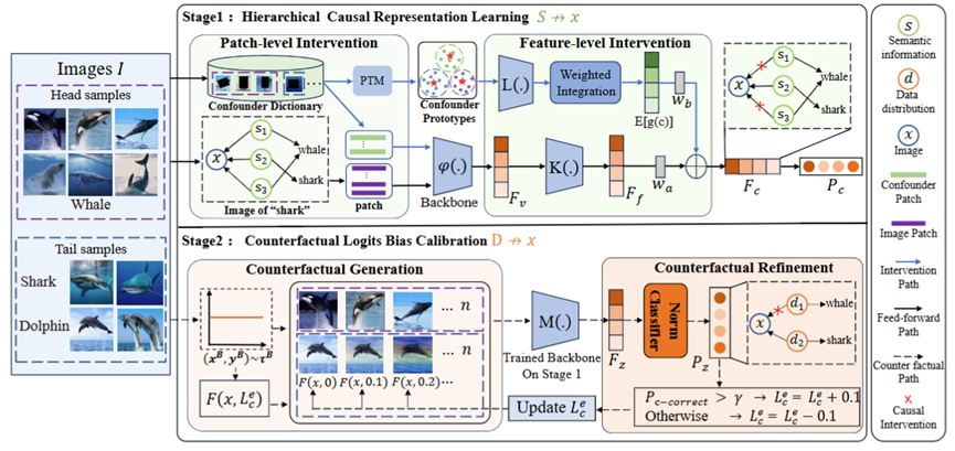 该论文探究了因果模型在CNNs与ViT架构中的差异性表现,首次揭示了ViT的全局特征表征特性阻碍了因果方法建立细粒度特征与预测的关联机制,提出了基于多尺度因果干预的双阶段因果建模方法(TSCNet)。首先,在分层因果表示学习阶段,该方法通过解耦背景与目标对象,在图像块和特征层面实施后门干预,阻断模型利用类别无关区域进行标签推断的路径,从而增强细粒度因果表征能力。其次,在反事实逻辑偏置校准阶段,通过自适应构建反事实平衡数据分布,优化模型决策边界的训练过程,消除数据分布导致的逻辑输出伪关联。在多个长尾基准数据集上的大量实验表明,所提出的TSCNet能有效消除数据不平衡引发的多重偏差,其性能显著优于现有方法。