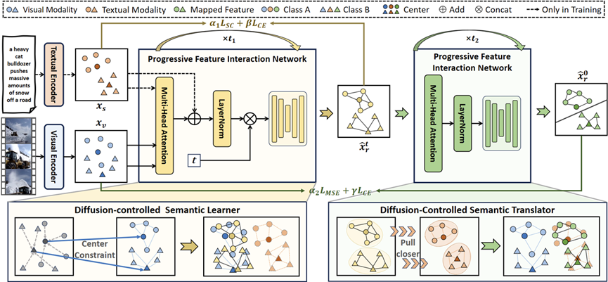 为了解决这个问题,该论文提出了一种语义空间干预的扩散对齐方法(SeDA)。考虑到两种模态的特征在分类中共享相同的类别级信息,SeDA将语义空间作为视觉到文本投射中的桥梁。此外,SeDA还提出了一个双阶段扩散框架,实现两种模态之间的渐进式对齐。具体而言,SeDA首先利用扩散控制语义学习器,通过约束扩散模型的交互特征与视觉特征的类别中心,建模视觉特征的语义空间。随后,在SeDA的后续阶段,扩散控制语义翻译器专注于从语义空间中学习文本特征的分布。同时,渐进式特征交互网络在每一步对齐过程中引入渐进特征交互,逐步将文本信息融合到映射特征中。实验结果表明,SeDA在多个场景下实现了更强的跨模态特征对齐,相比现有方法,表现出显著的性能提升。