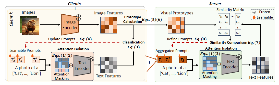 为弥补这一不足,本文提出了全局提示优化与非干扰注意力掩码(GPR-NIAM)方法。该方法通过一种掩码机制避免对原始标记嵌入的修改,从而在跨任务间保留可迁移的知识。可学习提示嵌入与原始文本标记嵌入之间的交互是单向的,这保证了后者保持不变。具体而言,GPR-NIAM包含两个主要模块。首先,注意力隔离模块通过一种新的掩码策略选择性地调控提示信息的流动。它抑制可学习提示标记在所有编码层中对原始文本标记的注意力,从而有效防止对文本输入标记嵌入的改变;此外,它还对反向注意力进行重加权,以鼓励模型更有效地从原始文本中提取与任务相关的特征。其次,跨孤岛协作优化(CSCR)模块利用来自多个客户端的视觉表征,并结合多源视觉监督,以集中方式优化全局提示,从而进一步缓解数据异质性带来的负面影响。大量在十个基准数据集上的实验表明,GPR-NIAM 在类别层面和领域层面的泛化性能上均优于八种最新方法。