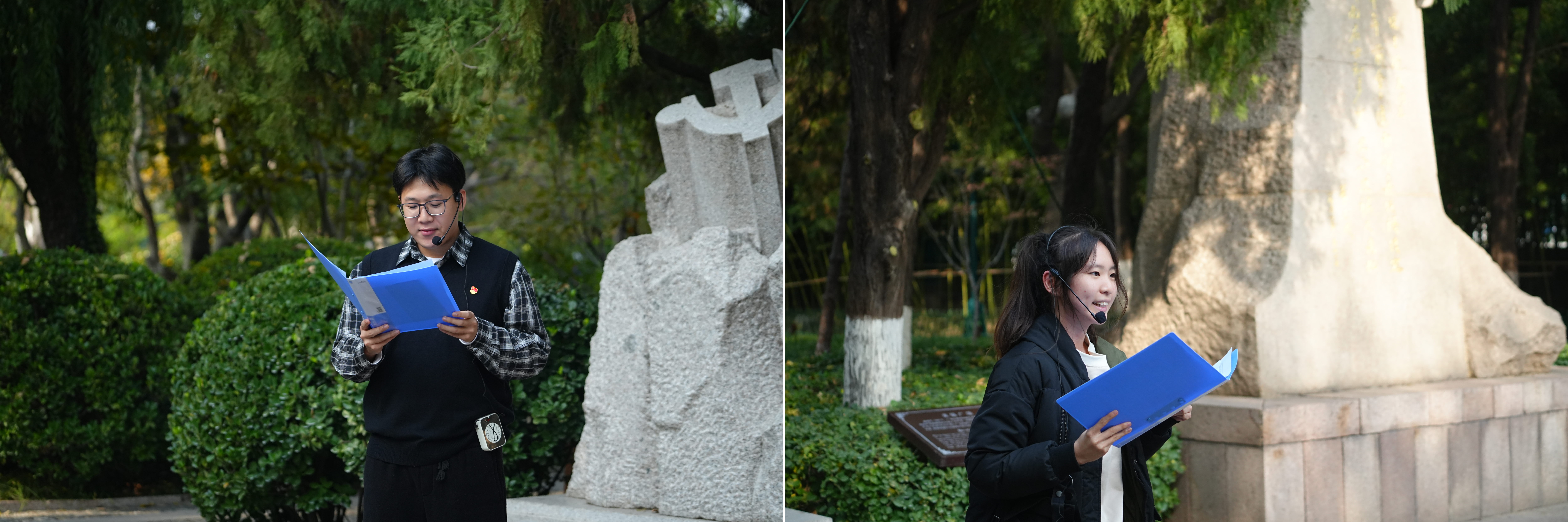 随后,全体人员转赴美铭广场,组织开展现场微党课教学。学生党员孟乐童以胶东早期共产党人的感人事迹为切入点,讲述了革命先辈宋海艇以教书为掩护秘密开展建党工作、宋海秋组建胶东首个农村党支部以及地下党员运用烟盒纸、灶灰水进行情报传递等生动史实,高度凝练地展现了共产党人扎根基层、忠诚信仰、英勇无畏的崇高品格。王孝垚同志则深挖“美铭”内涵,缅怀王尽美、邓恩铭等党的早期杰出领导人的丰功伟绩,并结合软件学院学科特色,激励青年党员深刻体悟革命精神的内核,自觉将红色血脉融入专业学习的实践探索与服务国家战略的科技担当之中。两场微党课立意鲜明、内容精粹、感染力强,有效激发了在场师生的政治认同、思想认同与情感共鸣,深化了对青年一代初心使命与责任担当的深刻理解。