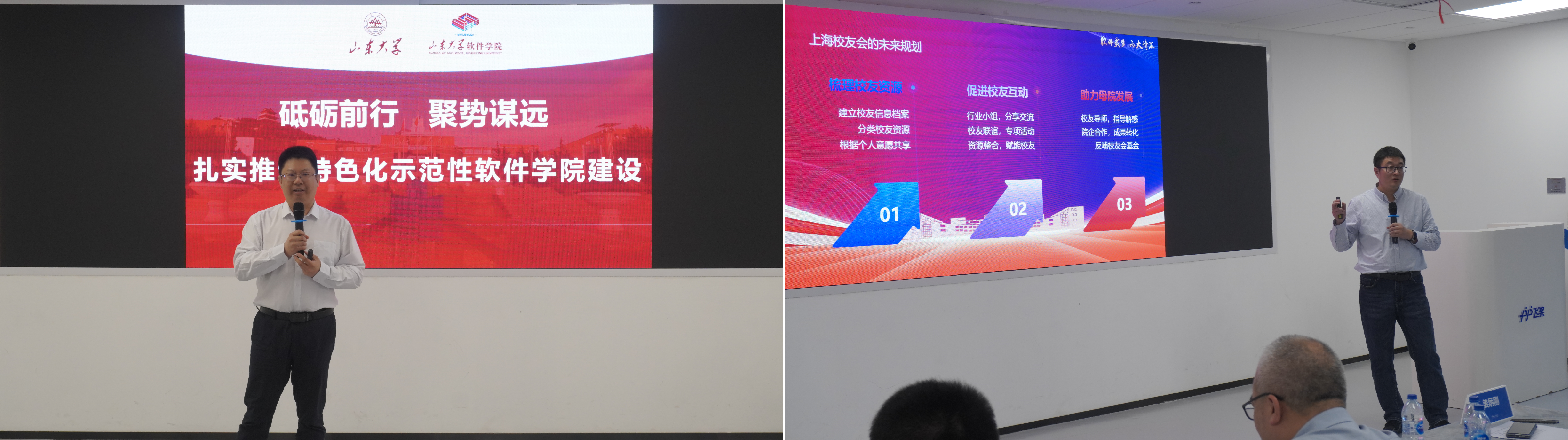 软件学院副院长周元峰详细介绍了软件学院在学科建设、人才培养及科技转化方面的重要成果。软件学院上海校友会会长李秀金围绕校友会的发展规划,提出以“汇聚资源、赋能创新、合作共赢”为目标,推动校友企业联动、专业交流与校际合作。