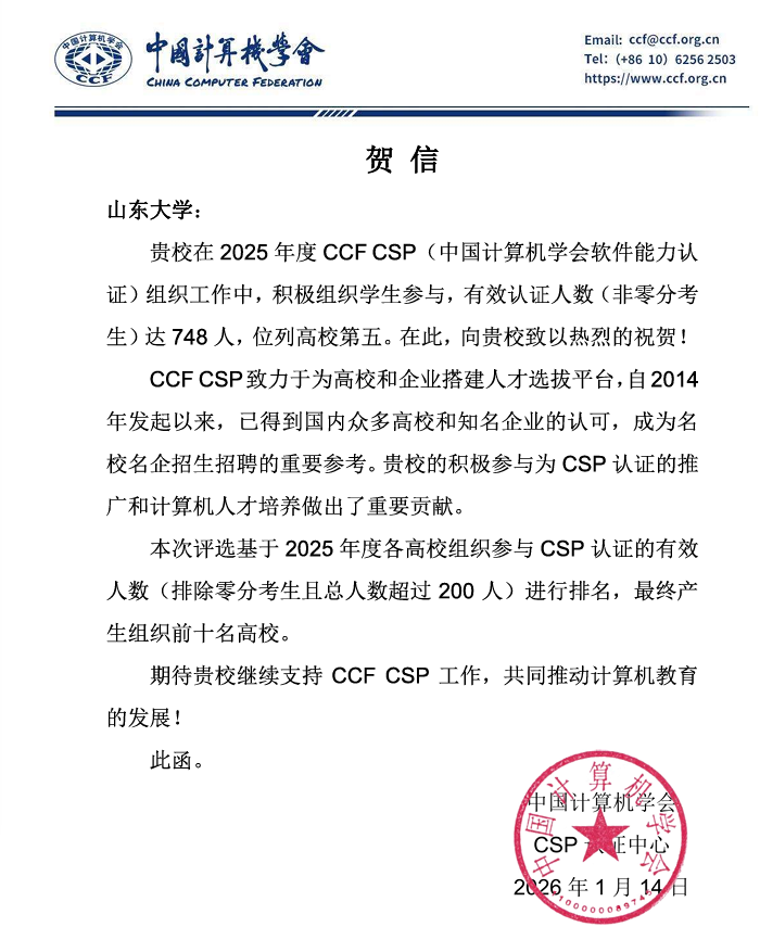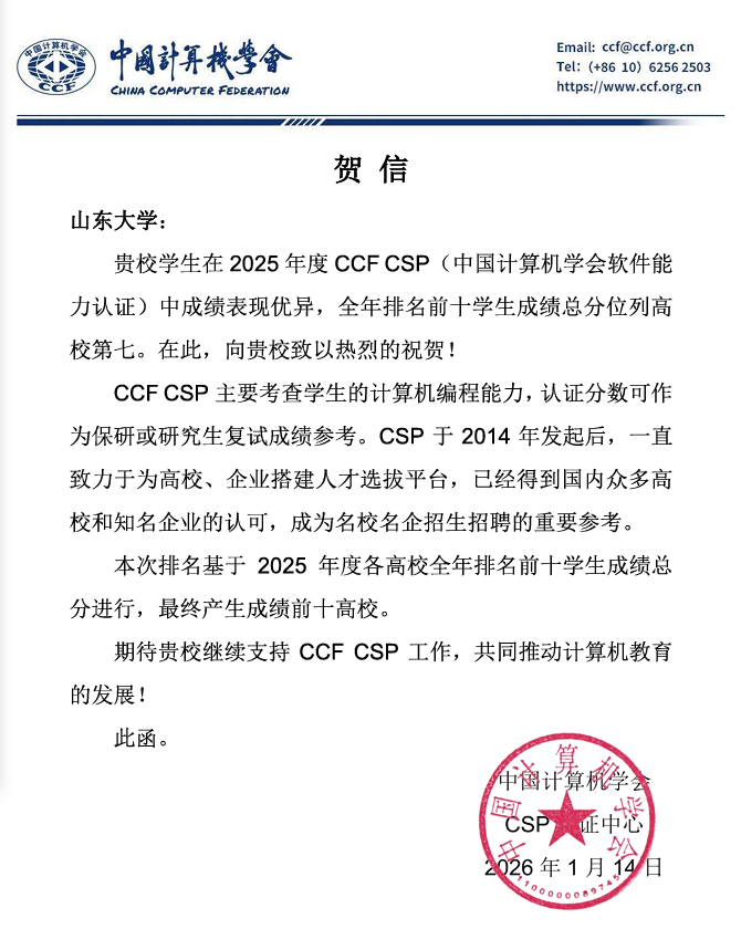 近日,taptap点点体育收到来自中国计算机学会(CCF)CCFCSP认证中心发来的贺信,祝贺taptap点点体育进入2025年度CSP成绩前十高校,以及2025年度CSP组织前十高校。根据2025年度CCF软件能力认证(CSP)高校排名,taptap点点体育凭借优异表现成功入选全国高校前十,同时斩获高校成绩排名第七与有效认证人数排名第五的双料佳绩。